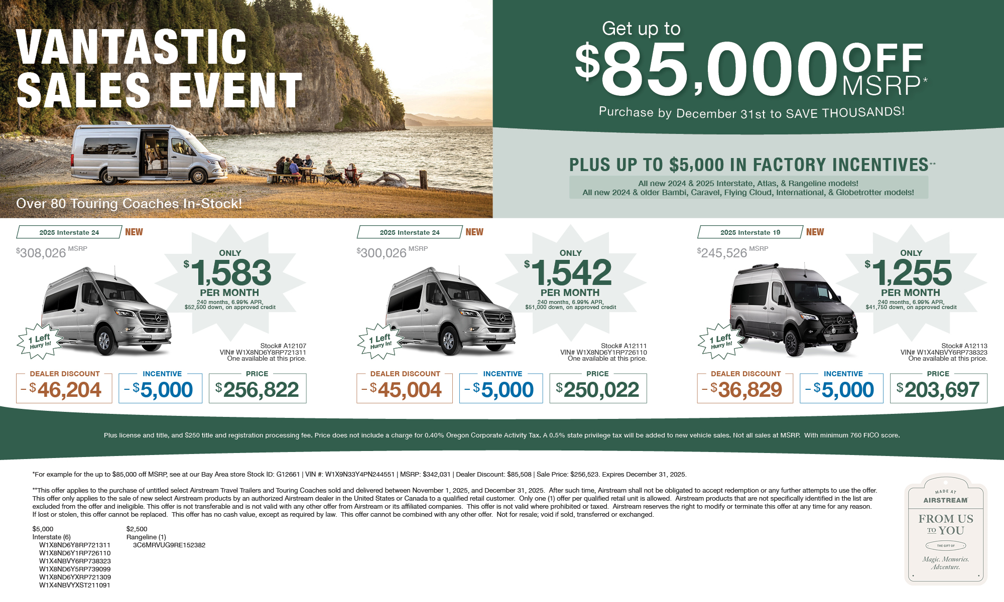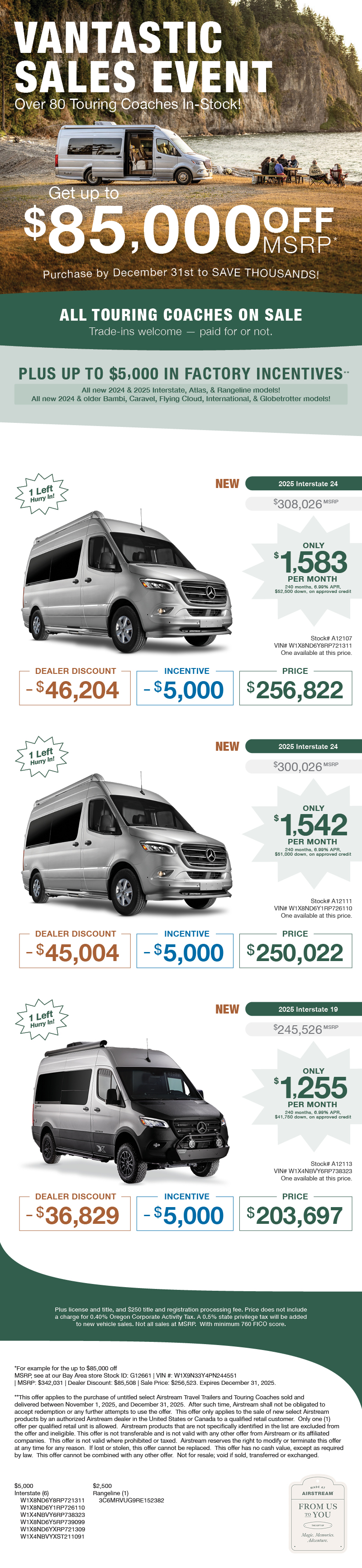 2025 Airstream Atlas™ Murphy Suite The Atlas Touring Coach is our most luxurious touring coach to date. It’s a Class B RV built on the legendary Mercedes-Benz® Sprinter van chassis and inspired by our trailblazing Airstream Interstate series. In fact, with its power slide-out, richly appointed features and finishes, and understated automotive styli...