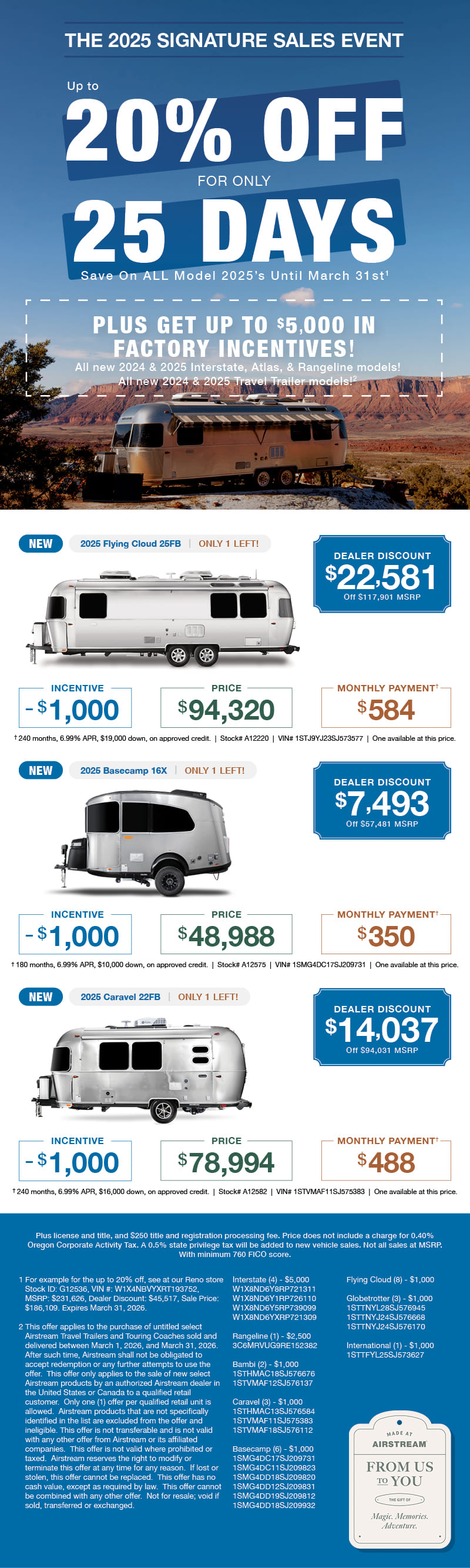 2024 Airstream Flying Cloud 27FB The Flying Cloud is our most popular, versatile, and family-friendly travel trailer. With more floor plans available than any other model, there’s a “just right” for everyone. And the light and airy design keeps you ready to float from one adventure to the next, bringing your comfort zone right along with you. The ...